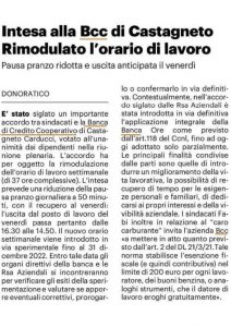 A seguito dell’accordo siglato tra i sindacati e la Banca di Credito Cooperativo di Castagneto Carducci è uscito un comunicato Stampa su La Nazione il 5 aprile 2021